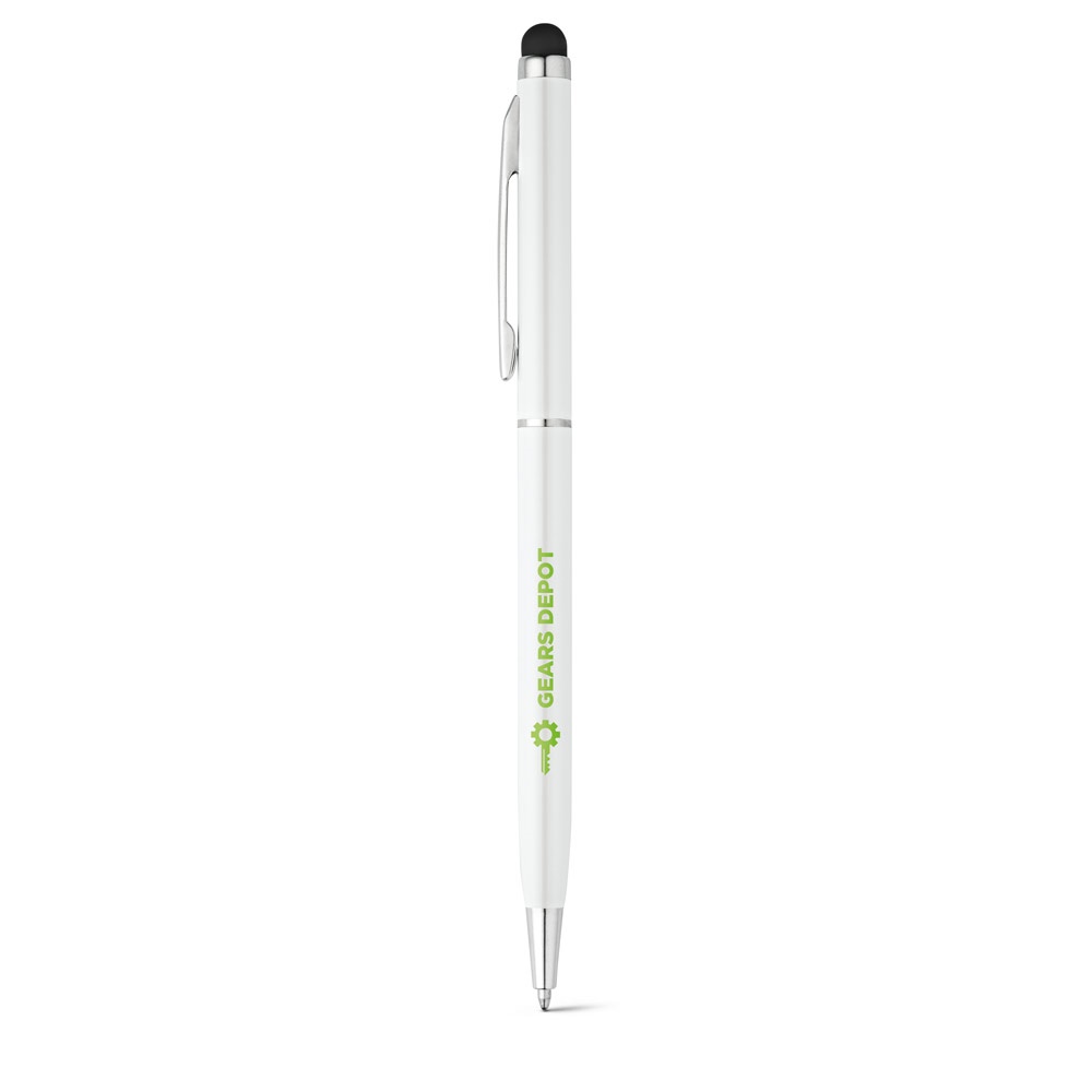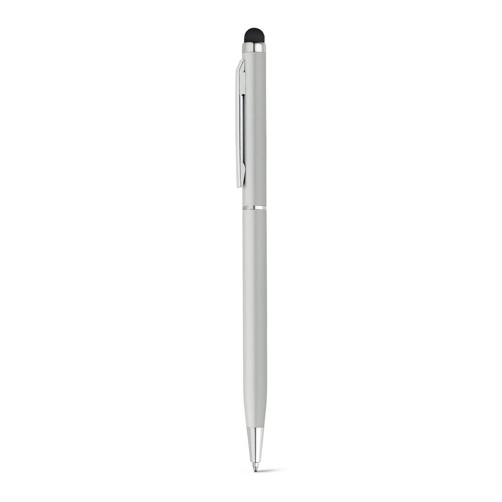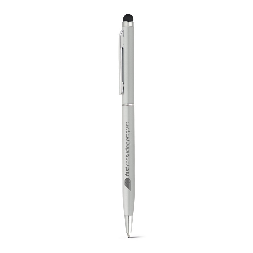 Esferográfica em alumínio com mecanismo twist, clipe e ponteira touch. Disponível numa variada gama de cores. Escrita a azul. ø8 x 135 mm